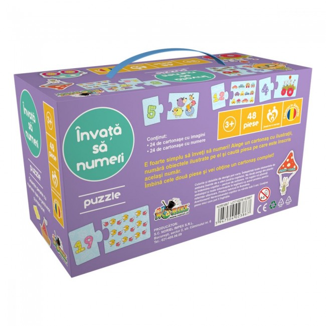 Prezentare: E foarte simplu sa inveti sa numeri! Alege un cartonas cu ilustratii, numara obiectele ilustrate pe el si cauta piesa pe care este inscris acelasi numar. Imbina cele doua piese si vei obtine un cartonas complet!