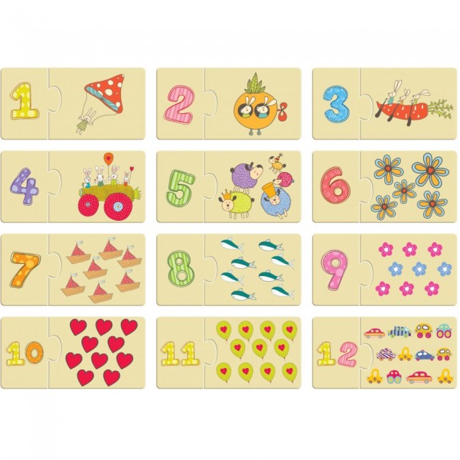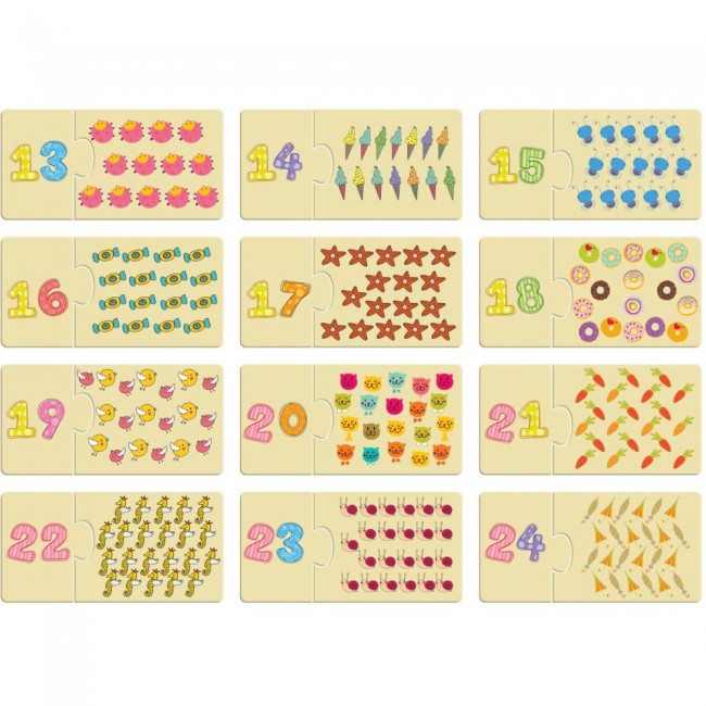 Setul contine 48 de piese, dintre care 24 cu numere de la 1 la 24 si 24 cu imagini reprezentand multimi de 1-24 obiecte. Copilul trebuie sa asocieze corect piesele numerele si imaginile si sa imbine piesele care se potrivesc, astfel incat pe piesa din stanga sa fie inscris un numar egal cu numarul de obiecte de pe piesa din dreapta. Exemplu: piesa cu numarul 5 se potriveste cu piesa pe care sunt illustrate 5 oi. In urma imbinarii pieselor rezulta 24 de cartonase.