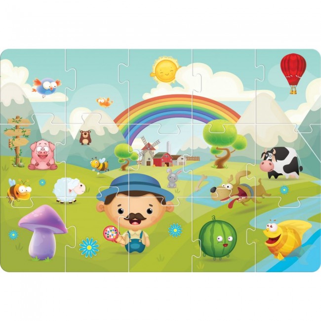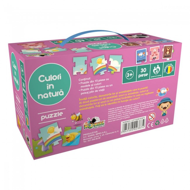 Prezentare: 2 puzzle-uri de asamblat, 15 animalute de gasit, 15 culori si modele de invatat! Gaseste animalutele din puzzle-ul culorilor in puzzle-ul naturii!